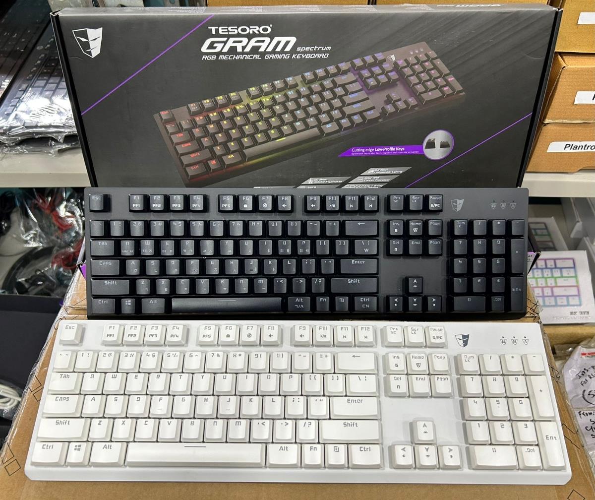 The Gram Spectrum boasts a sleek, low-profile design with a solid metal backplate that enhances structural integrity and light diffusion. The keyboard is available in black and white color options, featuring double-injection keycaps for durability. Its slim profile and responsive switches make it suitable for both gaming and typing tasks.